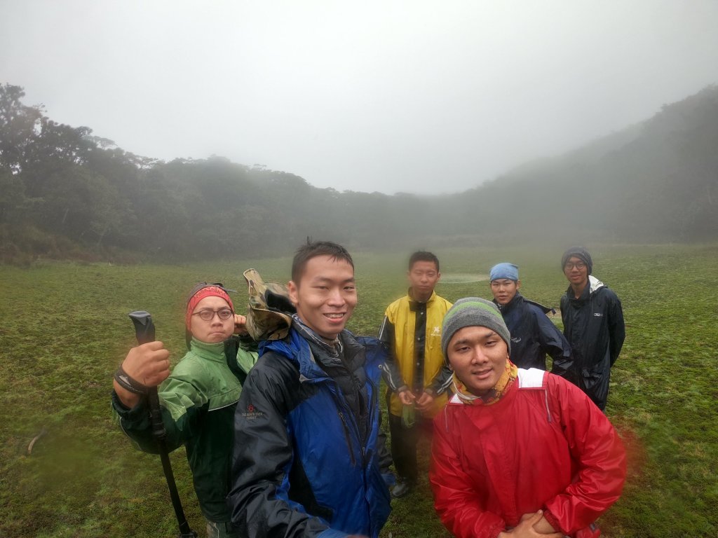 一拜一拜地上坡,遙拜山就到了,拍個攻頂照,再繼續一拜一拜地下坡, 途中都蠻好走的,快樂地聊天說笑,開始習慣這天天穿雨衣的日子。