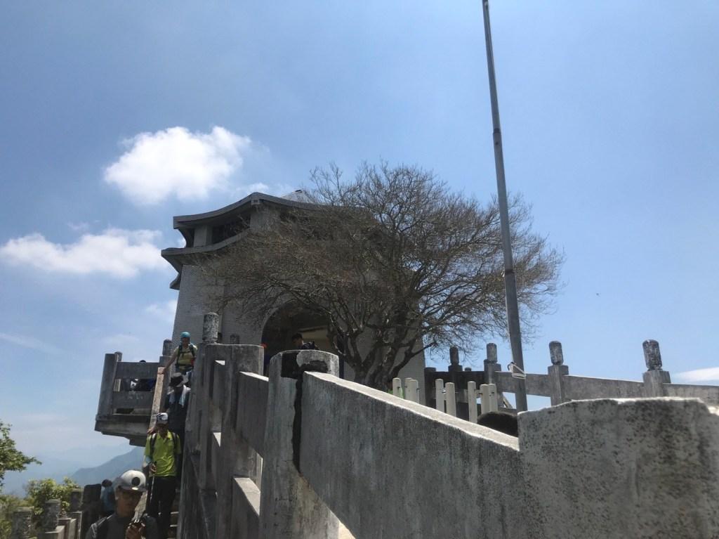 攻抵前,會交會一個石階斗上,我能說那裡絕對是最瘋狂的一段路,我使出四輪傳動才得以前進。抵達山頂,可以看見一壯觀的建築物,真的與中正紀念堂頗有類似,那邊可以上二樓,有非常棒的展望、景緻,是很好的休息點,不過假日人真的很多喔!這段時間,我們嗑了餅乾、水果還有吃到怕的果凍,也與一些爬山新手聊聊對登山的看法,大家其實只想下山,衝去糖廠吃冰。