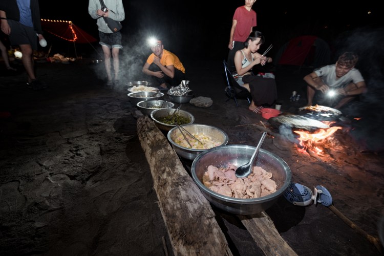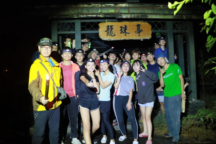 傍晚我們來到了龍頭山腳下的沙地紮營,一片荒涼的沙地在我們分工合作下,搖身一變成為了一片足以讓我們安心入睡的溫暖小窩,我們升起了營火,開始煮食我們的晚餐,大家在一片歡樂的氣氛中大快朵頤。飽餐一頓後接下來就是最刺激的夜遊了,我們拿著火把戴著頭燈,登上龍珠庭,在登頂合照後我們才依依不捨的回到紮營處結束美好的第一天。